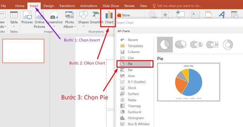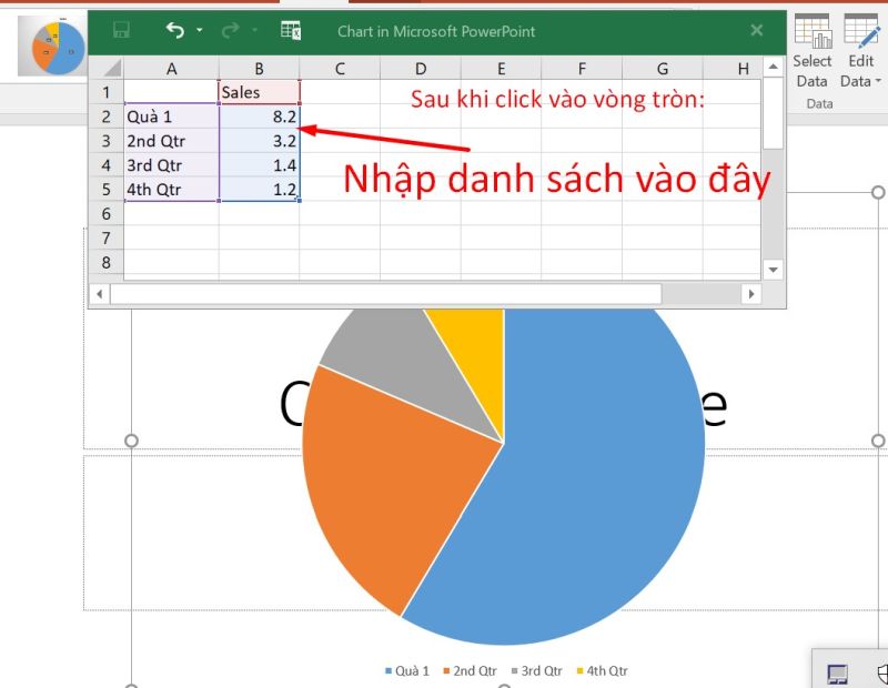 Chọn → Chart → Pie để thêm biểu đồ tròn. Trong bảng dữ liệu Excel xuất hiện, nhập cột A là nội dung (quà, tên...), cột B là số “1” cho mỗi dòng để tạo các ô đều nhau.