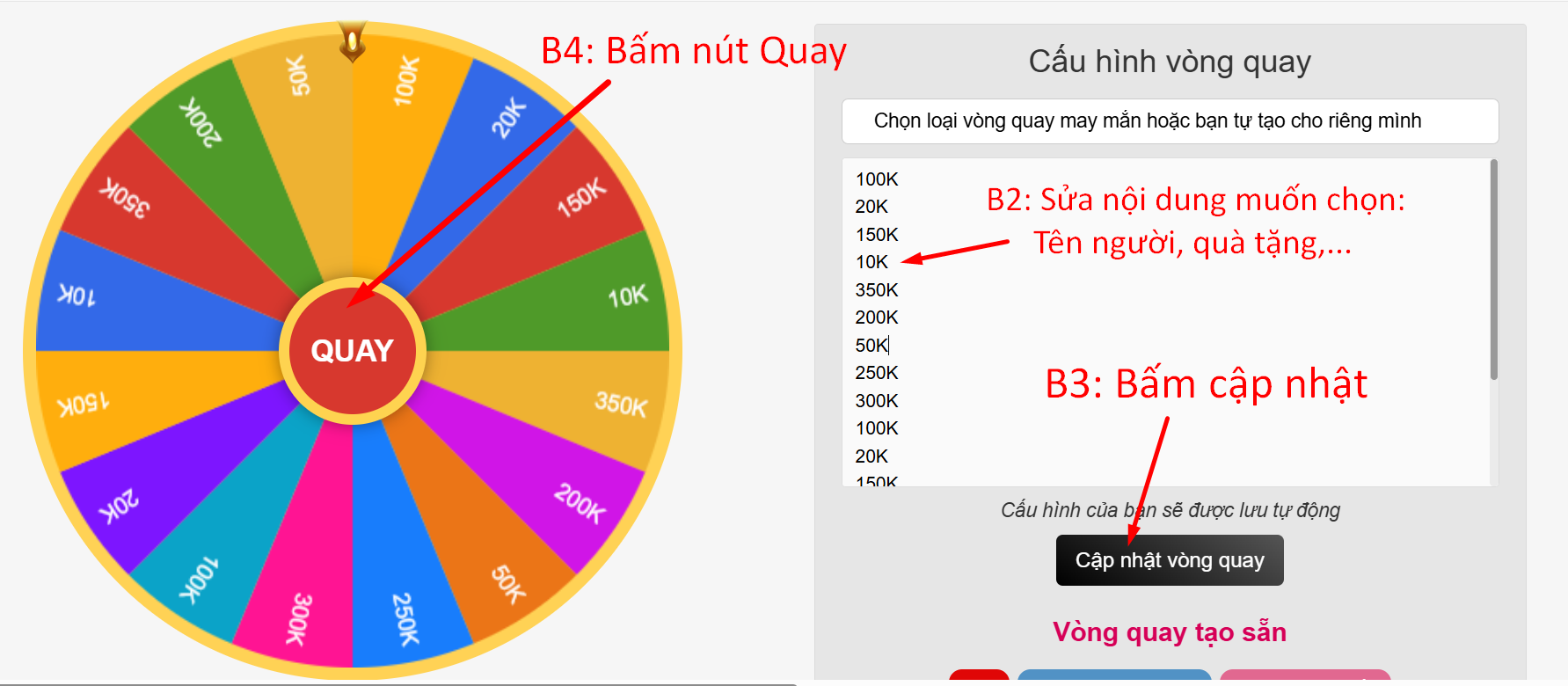 Chọn loại vòng quay may mắn hoặc bạn tự tạo cho riêng mình